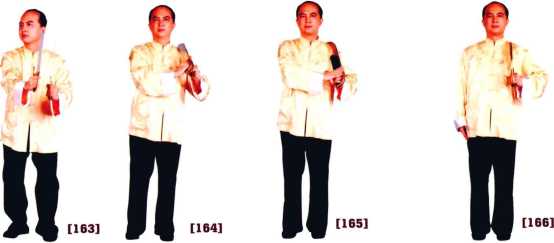 163-164双脚并拢站立两刀合于左肩处且刀背靠于左肩