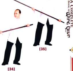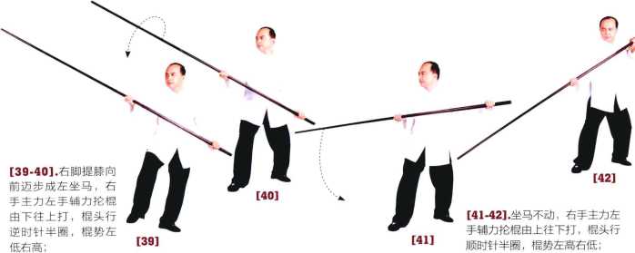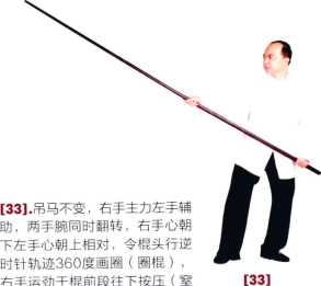 34-35吊马不变两手合力抖腕将棍头迅速点下再弹起。