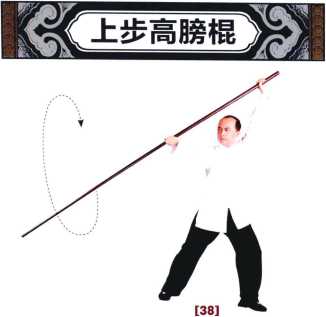 38左脚向前迈步成左弓步双手将棍上举过头,左手伸直棍势左高右低呈45°,形成高膀棍。