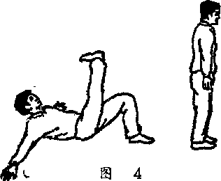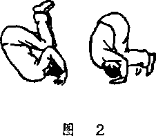 两腿开立屈膝屈髓含胸收腹攸下颗两臂斜唾于两龌外握虚拳随之尸上体后仰膝向前下顶同时起右脚挺腹勾头两臂左右分开手心向下由前后摆以手掌小臂内侧和大臂肩部-背部成字形同时着地拍地缓冲目视前上方(图4)