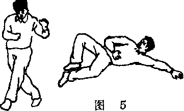 2右腿屈膝下%身体向左恻倒地下颌里收同时左臂内侧和手掌同时拍地作缓冲左脚外侧着地右腿屈膝脚掌撑地成剪子步右手放在腹上左手迎护头微收艘收靓、目视前上方(图5)