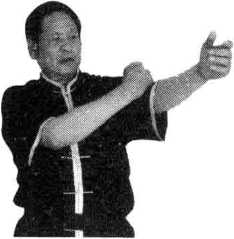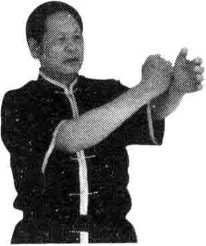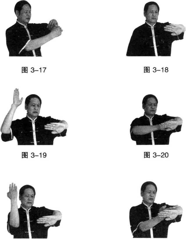 (4)左掌上提前伸掌背向上右掌向上抬起使掌背向前准备用右掌背击拍左掌背目视左掌背(图3-21)。