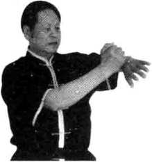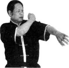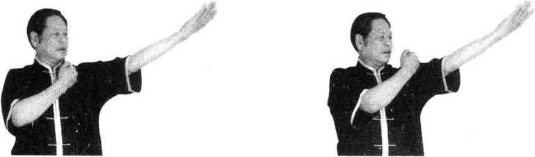 动作说明左手臂向左伸出外旋使掌心向上以右拳后溪穴处打击左侧的极泉穴九次使拳心向上目视左前方(图3-32)。