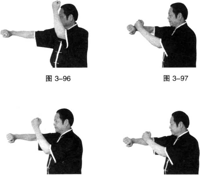 动作说明同击打阳池穴左势唯左右相反(图3-96、图3-97)。