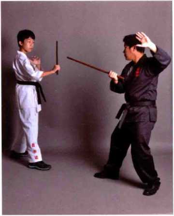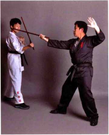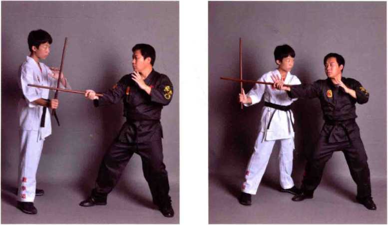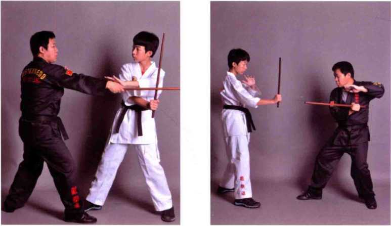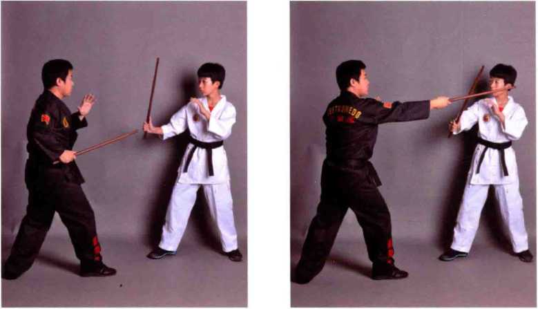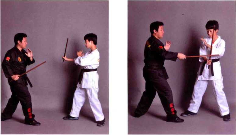 高位内向拍挂式格移:实践者右手持棍,由棍尖朝上开始从上向左向下再纵向做逆时 针拍打对手直线刺击而来的短棍,使其攻击路线偏置到自己身体之外,如图4-29、图 4-30所示。