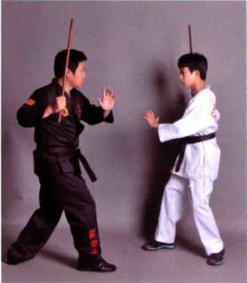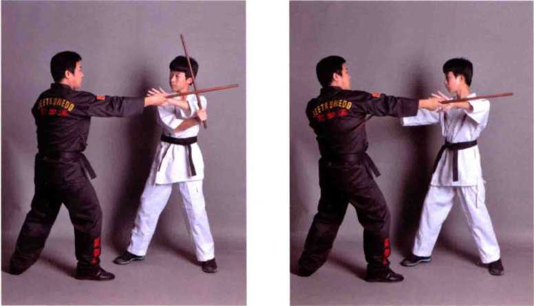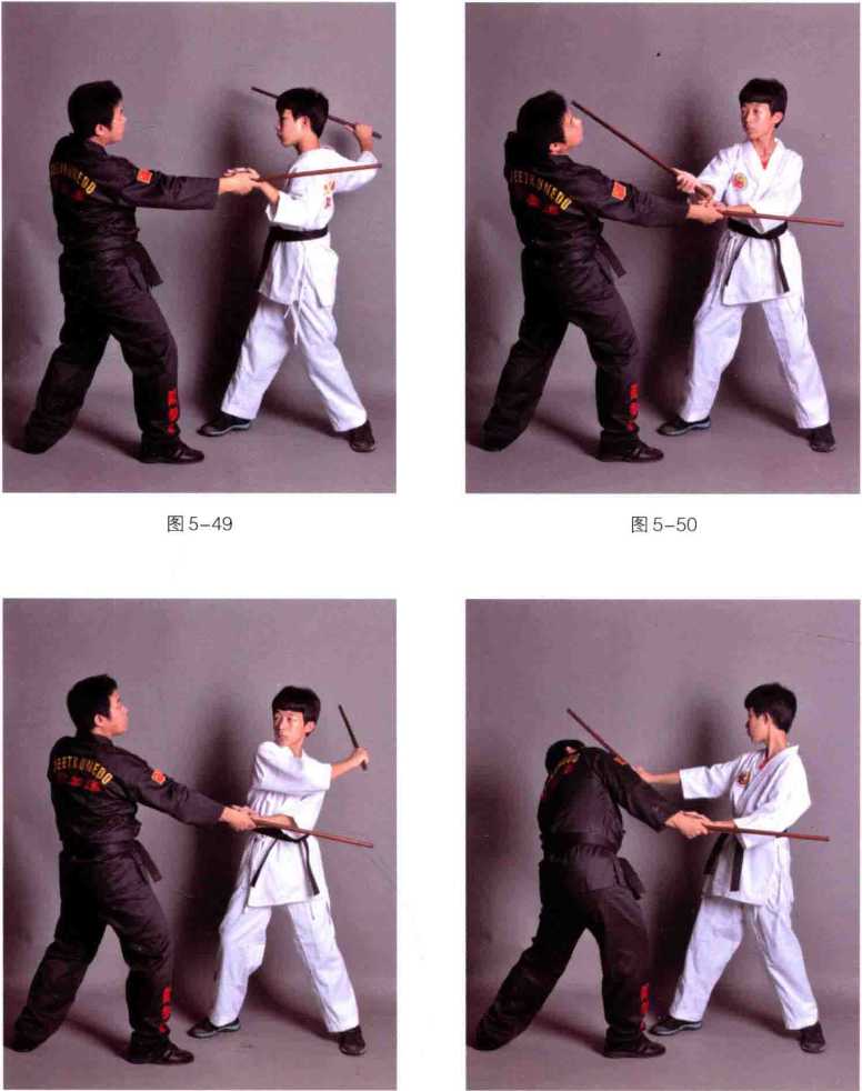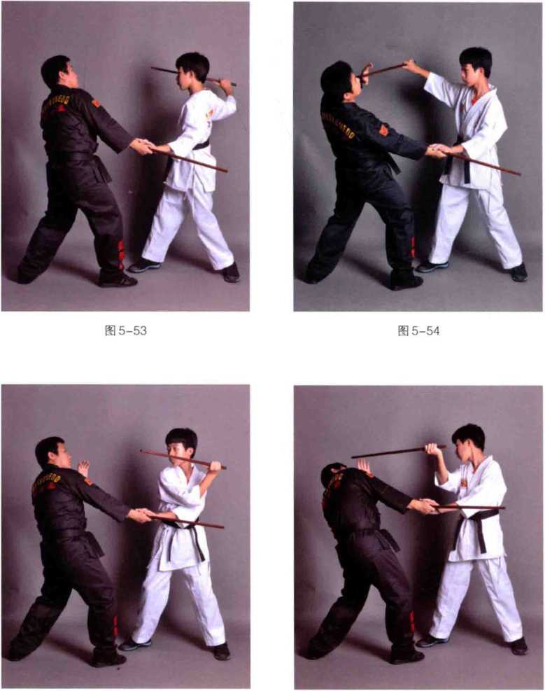 当对手做数字1、3挥棍攻击实践者左侧 头面部位时,实践者用短棍做向内的格挡接触 防御对手的攻击,同时用非持械手牵制对手的 攻击手;然后实践者短棍过位于对手的短棍下 面,反手挥击对手的右肋下要害;把短棍收到 自己身体右侧,顺势做正反手挥击或刺击对手 的头颈左右两侧……