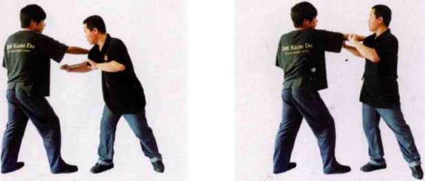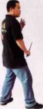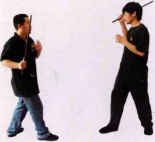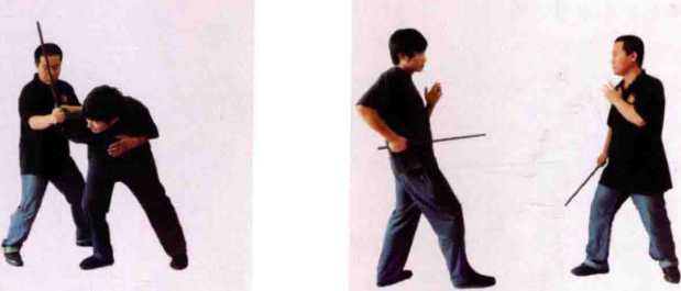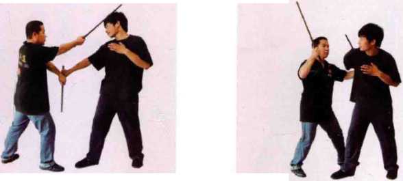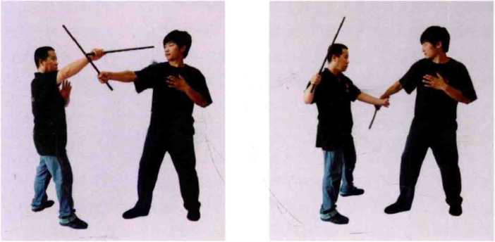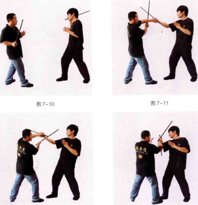 当对手实施数字1或3用短棍挥击实践者的左上要害的时候,实践者用短棍做内格挡; 用自己的非持械手控制对手持械手逆时针向其外后侧曲折其整条手臂撇别,与此同时用短 棍从其持械手臂肘下反手上穿刺其面;然后回臂勾住对手肘关节外侧,用自己的短棍尾端 卡住对手短棍尾端用力外折,进而达到完全锁制对手的目的。整个动作流程如图7-10?图