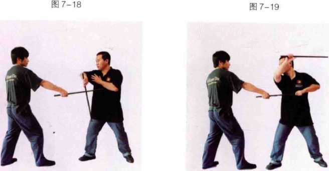 当对手实施数字2或4用短棍挥击实践者的右上要害的时候,实践者用短棍做外格挡顺 势回击对手头面:然后借机用非持械手抓住对手短棍近拇指处顺时针转动,使其短棍反背 于肩上;接下来用自己的棍尾卡住对手突出于肩头的短棍前端向下撇折,令其俯身受制。 整个动作流程如图7-14?图7-18所示。
