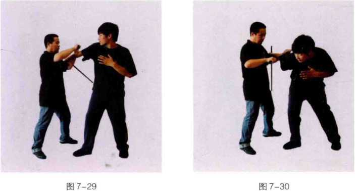 当对手用短棍直刺实践者中线要害时,实践者用短棍格移对手的攻击,同时用非持械 手抓住对手的短棍;然后顺势对对手头面做正手横向挥击;接着持棍手内挥趁机把对手的 短棍夹于自己右腋下,把对手持械手臂拉直肘关节反置于自己短棍之上,双手合力上抬短 棍反关节对其肘位施力,令其肘关节受制。整个动作流程如图7-19?图7-23所示。