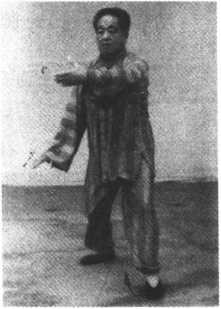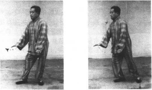 动作6:重心移到右腿,左腿变虚, 双手随身移动。图6。