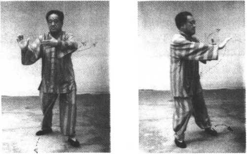 3. 此式连上三步,第一、二步都是向正南方向落脚跟后转脚尖 向东南,第三步向正东落步。
