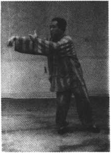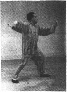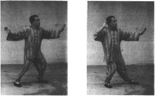 3. 收脚和迈脚都是横向的。成开立步时,两脚逐渐转换虚实, 中间有一骑马式的过程。收脚和伸腿迈步的过程是上下换手的过 程。