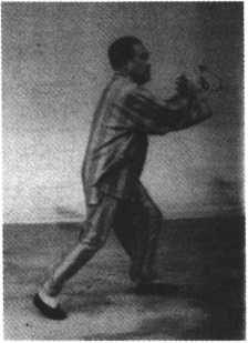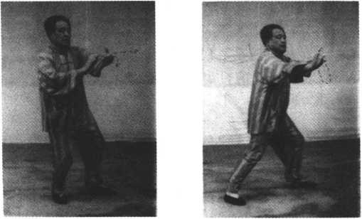在用法实施时,我以双手制住对方的前手,视对方变化,先分 开对方的手,使对方处于背势,后起脚踢对方。这与练法是一致 的,不分开别人击来的手不能踢脚,因为对方还有防守和攻击的机 会。此式运行时意念在手掌,分手时劲点在两腕小指一侧腕根处, 踢脚时,不用胯的力量,劲点在脚面。