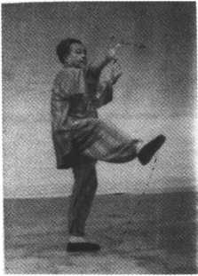 分开,两臂自然伸直,坐腕立掌,左臂向北偏东,右臂向东南偏南, 腕与肩平。接着提右膝带脚,以脚面向东南方向踢出,膝与胯平。 左腿自然直立。右臂在右膝外。眼向东南平视。图138。