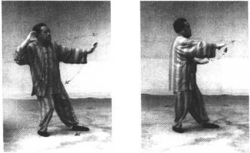此式有三个动作与前高探马式同。 最后的动作左手前穿时伸直,即手臂自 然伸直,手指也自然伸直,右手在左肘 下,不贴左肋。