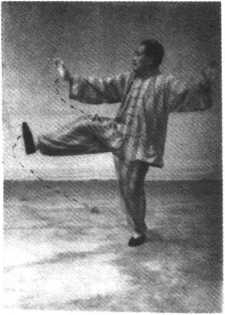 动作344:两手由里向外平肩分开,坐腕立掌,右臂向西偏北, 左臂向东南偏南。提右膝以脚掌向西蹬去。眼向西平视。图 344。