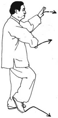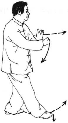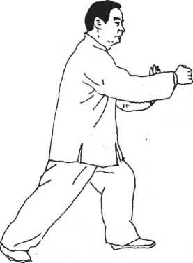 纠正:右腿外撇时,胯裆要松,右手搬拳时,身体不能歪斜,左手 向前出掌时,身体不能前倾,身随体转,上下相随。