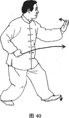 动作3接前式身体重心前移 至右脚踏实,左脚向前跨出一步,脚 跟先着地,同时右拳搬出后弧形抽 回至右腰旁,左掌经胸前划弧向前 方拦出,臂与肩同高,掌心略向右。 (图 40)