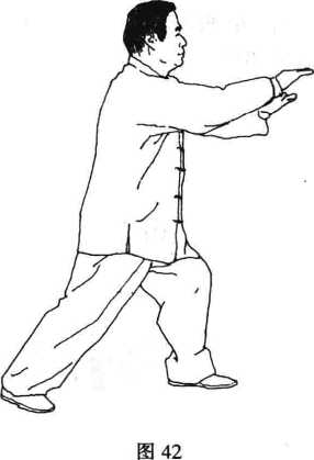 动作2接前式身体重心向后 移,两手左右分开,掌心斜向下,随 体后移至腹前。(图43)