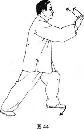 动作3接前式身体重心渐渐 向前移,右脚微蹬直,成左弓 步,同时两手向前按出,指尖斜 向上,目视前方。(图44)