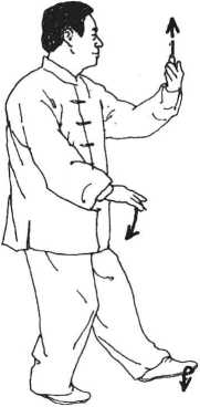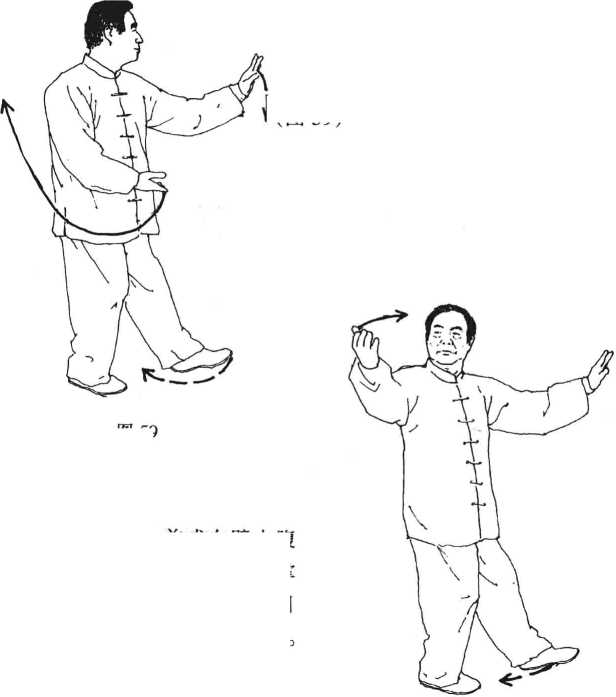 动作2接前式右臂由腹 前向右后抽,划弧屈臂上提,掌 略高于肩,指尖向后斜向上,目 视右手,左脚屈膝微提。 (图 60)