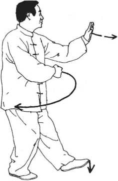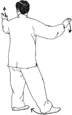 动作2 接前式左脚轻提外 旋,脚尖向北上翘,脚跟着地,同时 两臂向右回抹,身体前移转腰,两臂 随体左转。(图56)-