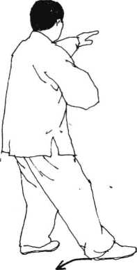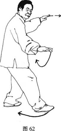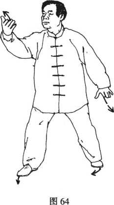 动作3:接前式右脚提起, 向东南角后插一步,脚掌先着 地,渐渐重心后移踏实,左脚尖 向右扣,右脚掌外撇左腿微蹬 直成右弓步,同时右臂随转体 经腹前向右上提,掌心斜向上, 腕与肩平,指尖向左,左掌经腹 前下落至左胯外侧,掌心向下, 指尖向前,目视右掌。(图64)