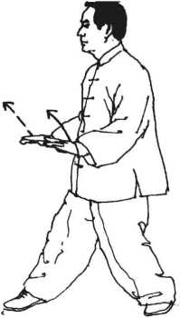 动作1接前式右掌外旋,左 掌前抹,掌心侧向下,两掌同时分 开,与肩同宽,再内旋坐腕,掌心相 对,手肘下垂,身体渐向后移。 (图 234)