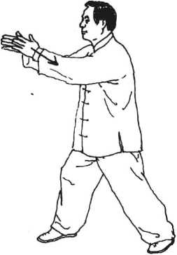 图236图236【易犯弊病与纠正】与前第3式 相同。【易犯弊病与纠正】与前第3式 相同。动作3接前式两臂随腰 向正南按出,两臂高与肩平,两 掌相距与肩同宽,掌心斜朝前, 指尖向上,身体重心渐渐向前 移,弓右腿,蹬左腿,成右弓步。 (图 236)