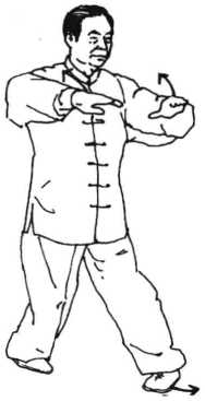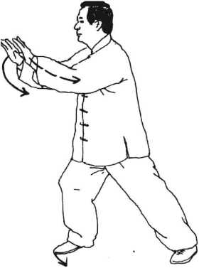 动作1身体重心逐渐后坐于 左腿,右脚尖随腰转,由南向左东北 角扣转踏平,两臂掌心朝下向左平 抹,接着身体重心移至右脚,两臂亦 向右划弧回抹。(图237)