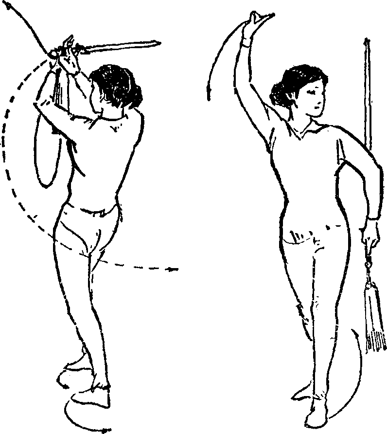 ,身体重心移 于右脚,左脚尖点地,两腿挺直成高虚步。同时,右手握成 剑指,由头上下落经身前、体右、后,再向右绕举于头右前 上方,手心向上,剑指向左$左手反持剑,由头上下落于体 左侧,手心向后,臂微屈,剑尖向上,剑身紧贴小臂。目视 左前方。(图119)