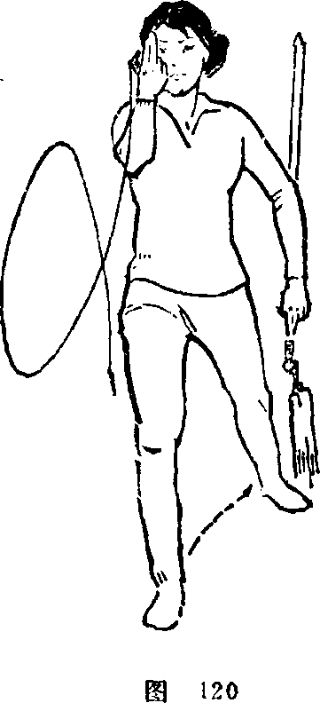 ① 左脚退后一步, 右膝屈,左腿伸直。同 时,右手手心翻向上下 落于头前,右臂微屈3 左手反持剑不动。目视 右手。(图120)