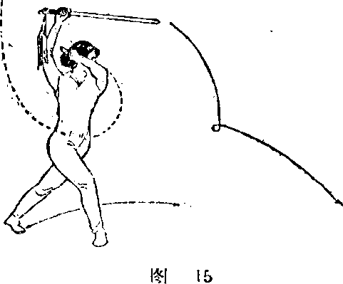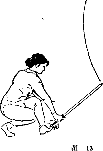① 上体半面向左转,两 腿半起立。右手持剑,由左 脚前向左上平架,手心向 里,高与头齐,剑尖向前; 左手仍扶右腕随右手向左上 架起。目视剑尖。(图14)