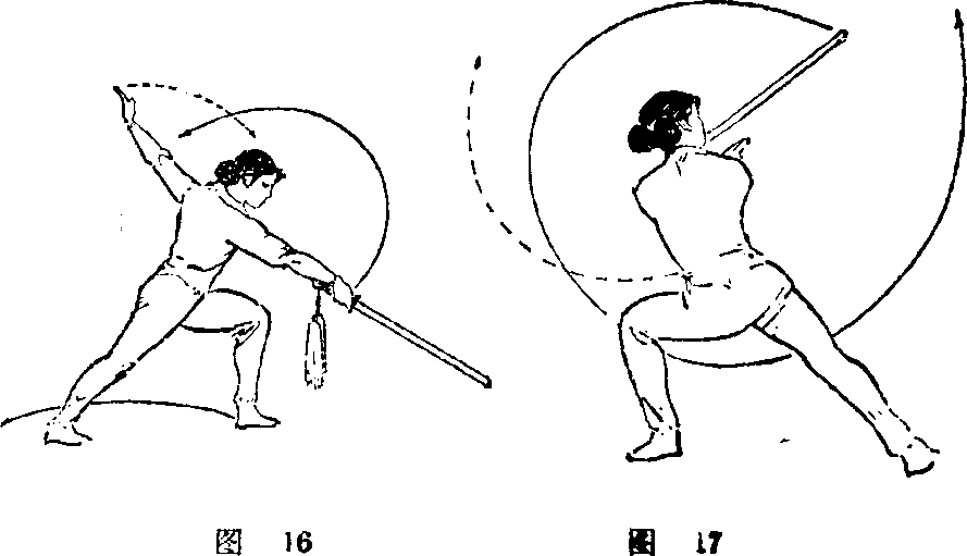 ① 上体半面向左转,两 腿半起立。右手持剑,由左 脚前向左上平架,手心向 里,高与头齐,剑尖向前; 左手仍扶右腕随右手向左上 架起。目视剑尖。(图14)② 右脚向前一步,脚尖 外敞,上体右转,两腿半蹲 成交叉步。右手持剑,小臂 内旋由左上稍下放再而右上 架起,手心向外,高与头 齐;左手仍扶右腕。目视剑① 上体半面向左转,两 腿半起立。右手持剑,由左 脚前向左上平架,手心向 里,高与头齐,剑尖向前; 左手仍扶右腕随右手向左上 架起。目视剑尖。(图14)② 右脚向前一步,脚尖 外敞,上体右转,两腿半蹲 成交叉步。右手持剑,小臂 内旋由左上稍下放再而右上 架起,手心向外,高与头 齐;左手仍扶右腕。目视剑四、左右上架剑(游鱼沉浮)