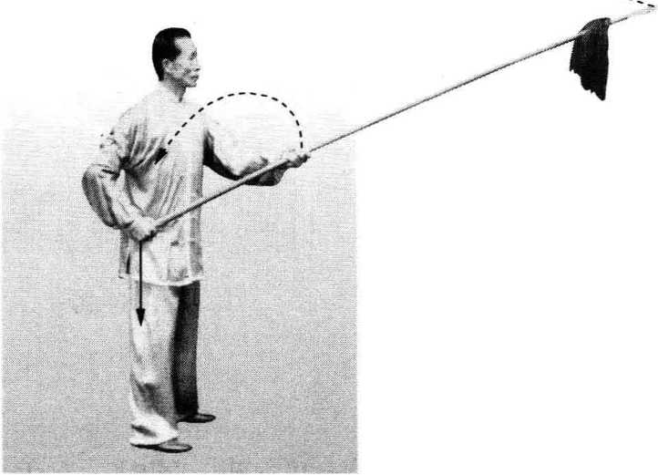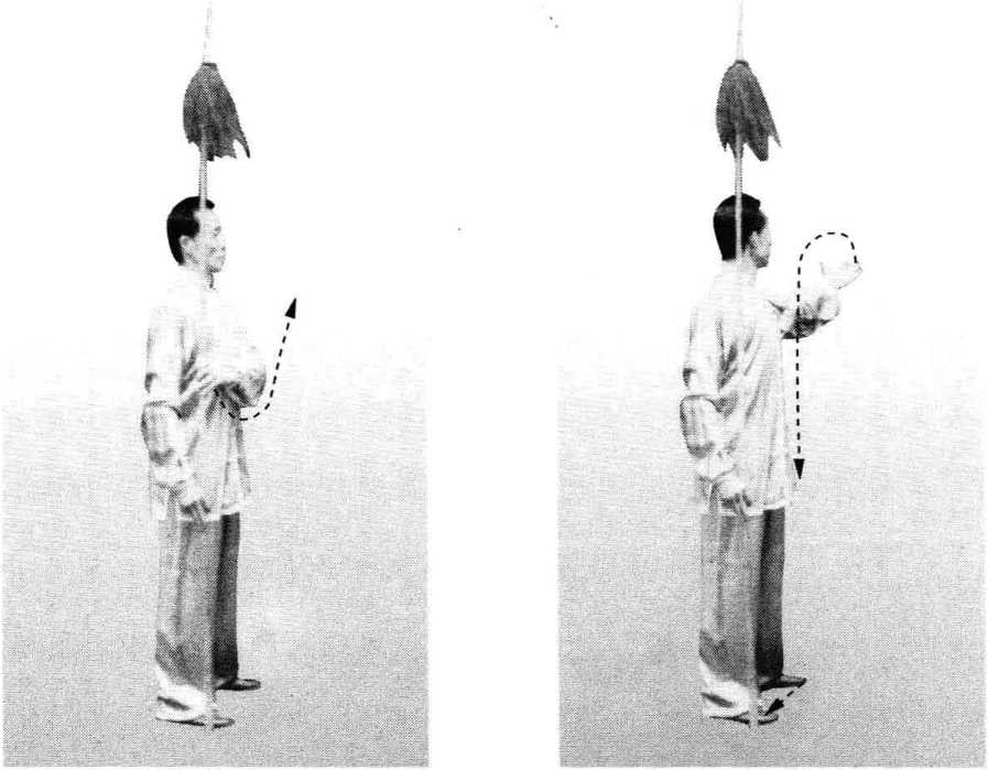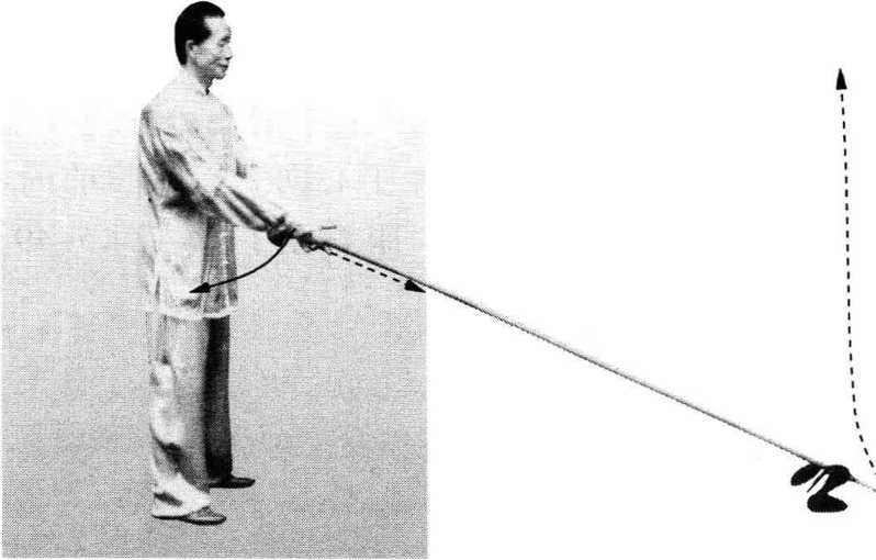 (1)开步抱枪右脚向右侧平行落步,两腿自然伸直,两脚尖向 前,与肩同宽,成开立步;同时,枪尖下落地面,左手 前伸至右手前接握枪身向前、向上挑枪,手心向上;右 手抽把贴至右腰侧,手心向里,两手成抱枪状,枪尖高 与头平;眼看枪尖。(图5-47、图5-48)图 5-47(2)收枪伸掌左手将枪身下压至右侧,右手滑握枪把使其落地, 枪身竖直身体右侧;然后左手心向上,从腹前向左引 伸至左肩侧,指尖斜向上;眼看左手。(图5-49、图 5-50)图 5-49 图 5-50