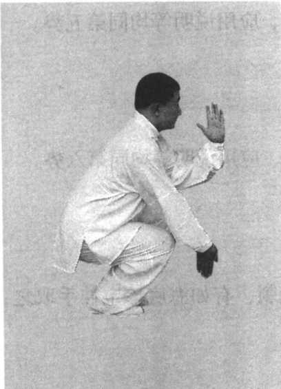 第三章杨少侯太极拳用架动作图解(一)右腿下蹲,左腿回收,左脚虚丁于右脚前。左手不 变,掌心向下,五指朝前,按于左膝外侧。右手旋腕,以食指