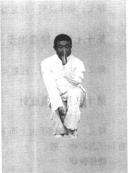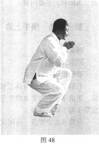 图49图49正面(二)双腿下蹲,身 体随之,然必须保持中正 直立。双手上下交错,右 手自胸前向前走弧线下插 至左足内侧,左手自膝旁 掌心向里,五指朝上,立 掌上穿至胸前,拇指与喉 齐(图49、图49正面)。