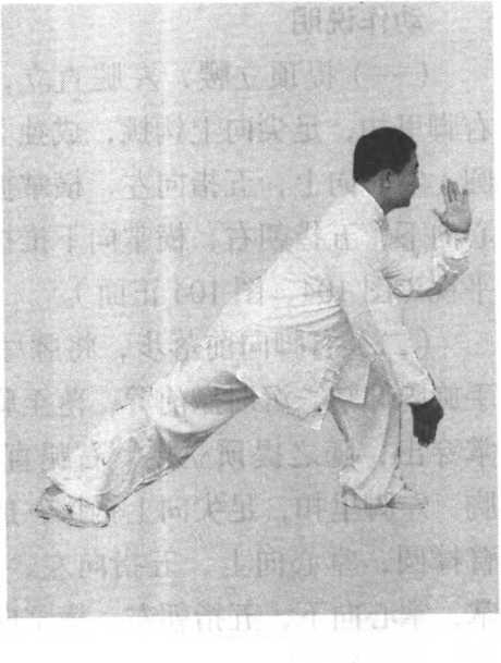 下身仆步要灵活,左肩做靠时要贴地而行,右手顺势而 发。整个动作必须顺势而用,切莫强求,周身上下要浑然一 体,方有效果。