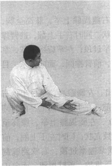 (一)身体左转面向正东,双手左前右后向前鼓荡,而后 向下采捋,左手掌心向里,五指朝前,停至左膝内侧,右手掌 心向里,五指朝前,停至裆前;随之左脚里扣90。,身体下 坐,臀部贴坐于右腿小腿,左腿伸直,身向正南,面向正东, 成下仆步;立腰提顶,上身立直(切勿前倾)(图102)。