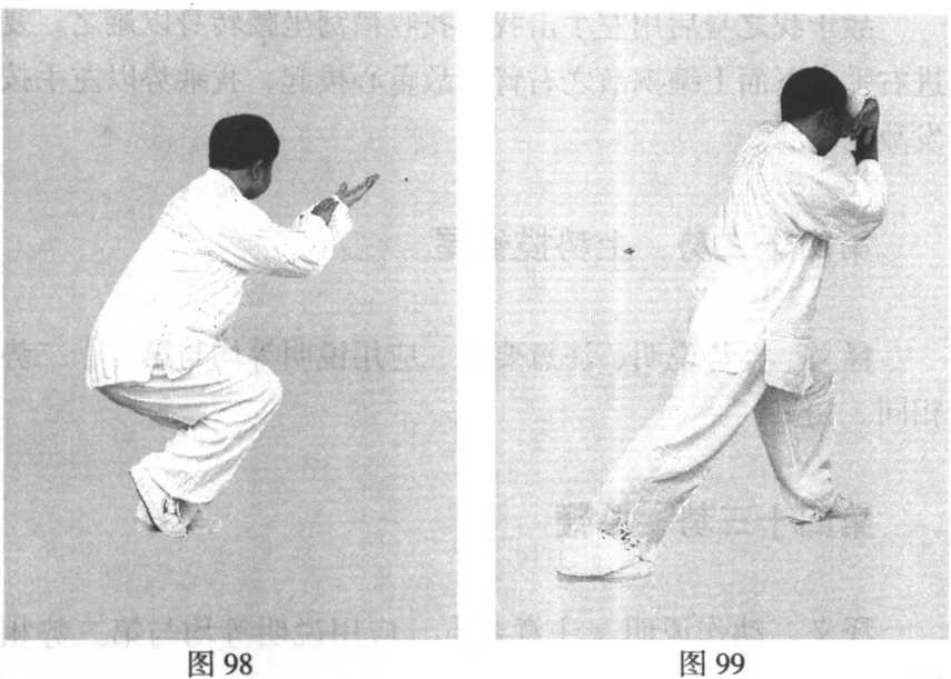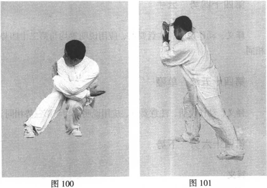 杨少侯太极拳用架真诠(九)左足以跟为轴,足尖内扣180。,右胯里合,提顶转 腰,身体随之右转,左腿屈膝下蹲;足尖与膝呈垂直状,右足 尖外摆约90。,与左脚遥相呼应,左腿伸直,全体重心坐于左 腿。左手下落、外推,掌心向外,五指朝前,护住右肩;右手 落于左肋下,掌心向上,五指向后,护住左胁。面向正西,目 视后方(图100 )。