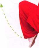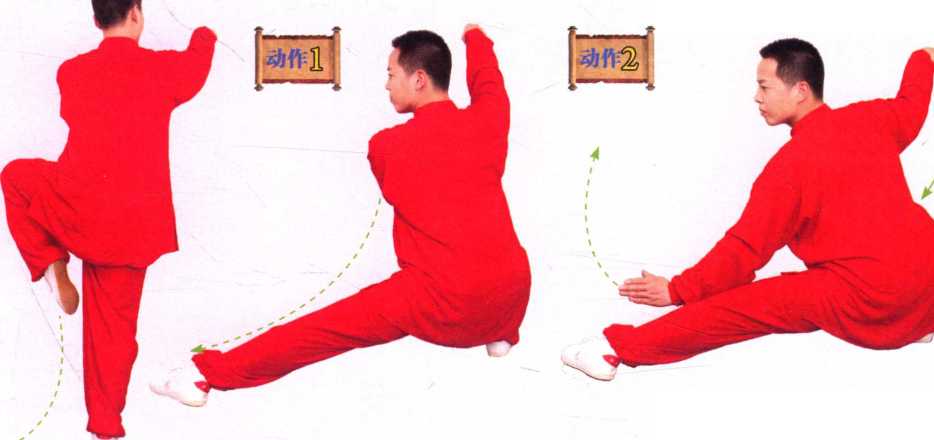 ①做仆步的动作时,忌上体前倾。以左仆步为例,右腿全蹲,左腿伸直, 两脚掌全部踏实,左脚尖略内扣,与右脚跟踏于中轴线。