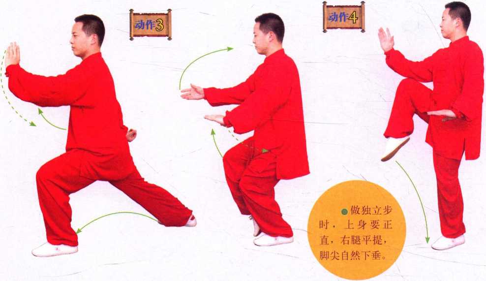 。右腿慢慢提起、平屈,脚尖自然下垂,成左独立 式,同时右勾手下落变掌,由后下方向顺右腿外侧、以弧 形向前摆出,屈肘立于右腿上方,肘膝相对,掌心向左; 左手落于左胯旁,掌心向下;目视右手。