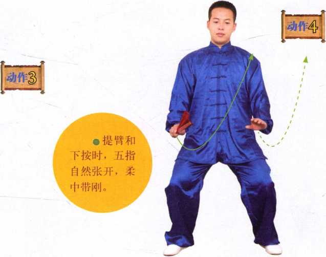 ;为力点,双臂由下向上缓缓提起,约与 :肩同高;目视前方。