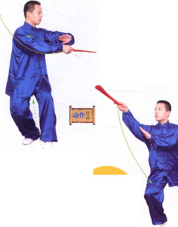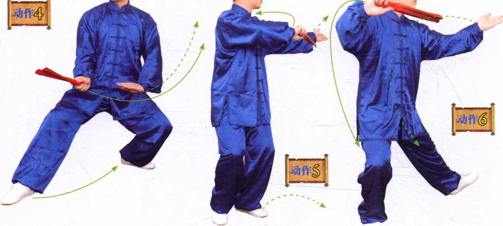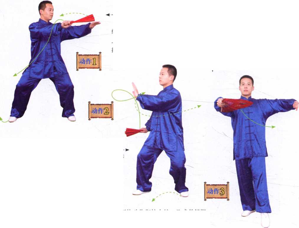 ;全移到右脚,同时右手扇上提, i左臂随之合于右肘关节内侧;身 \体转向正前方,左腿朝前上步成 ■高点步;同时左臂下落朝左侧横 :摆掌,掌心朝外,指尖朝前,右 i手扇在点步一瞬间平开扇于胸 :前,扇柄前后一条线,扇沿朝 :左;目视前方。