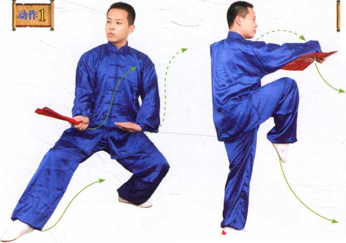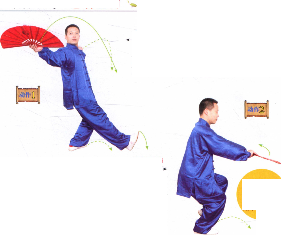 ②提膝和开扇动作要协调一致,尽量同时完成。