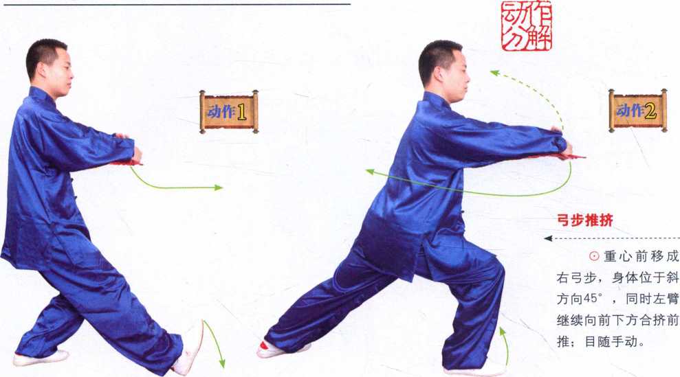 ② 马步、转体、合扇和 架掌动作要同时完成。