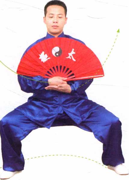 。左腿屈膝,身体随之后坐,重心移于 两腿之间,右脚尖内扣成马步;同时双臂上 举至头上方;接着,马步坐胯,双臂合于腹 前,左手掌心托于右手下,扇置于胸前。