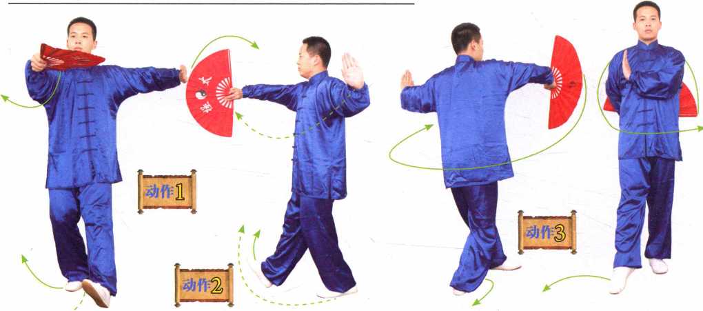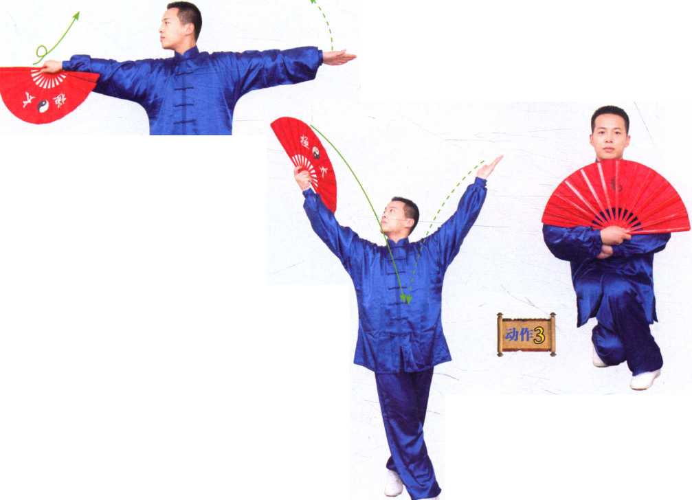 。重心移到右腿, i左腿随之弧行出步,身体 :继续右转;同时右手立扇 :随转体朝体侧反臂拨扇, i左臂则下摆于身体左侧, i掌心朝外,小指一侧朝 ;上;目随扇走。