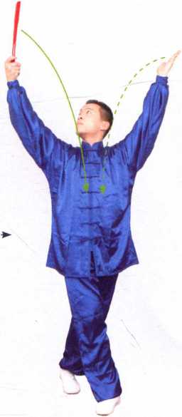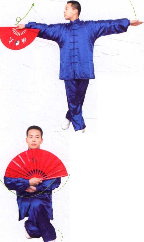。两臂内旋上举,右手将扇托 旋转一圈;目视右扇。