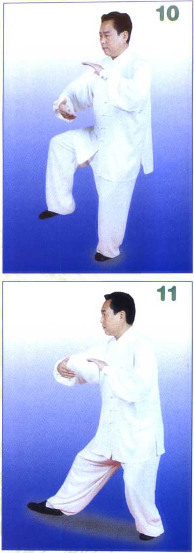 右脚向正西迈出一步,先以脚 跟着地,随着重心前移而全脚踏实。 (图 11)
